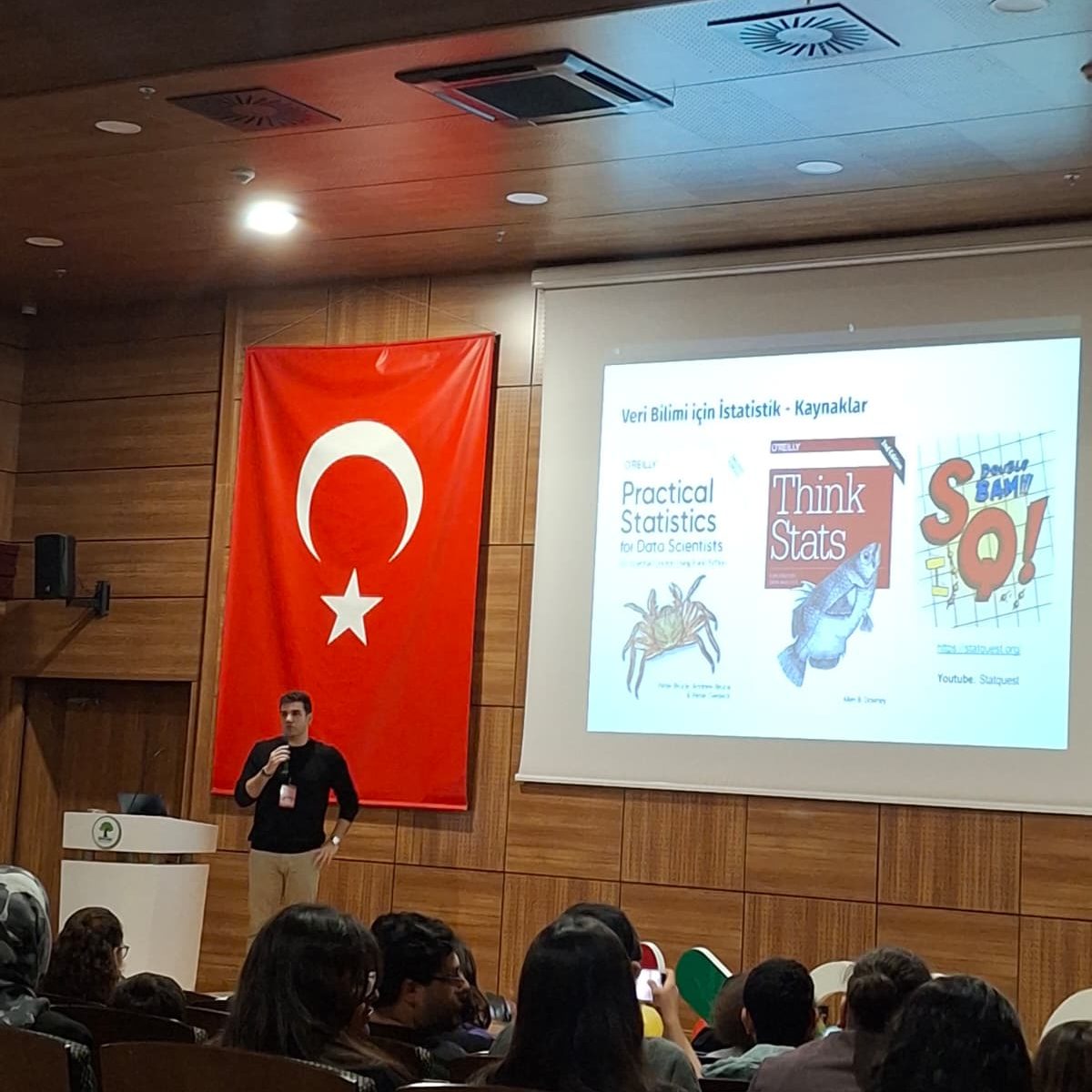 Mert Cobanov’un veri bilimi ve istatistik sunumunun bir kısmını dinledikten sonra kendisiyle konuşma fırsatı buldum. En çok konuştuğumuz konu, kaynak seçimi konusundaki yaklaşımıydı: Udemy veya Coursera yerine kitap okumasını öneriyor. Kendisi de aktif olarak kitap yazıyormuş şu an.