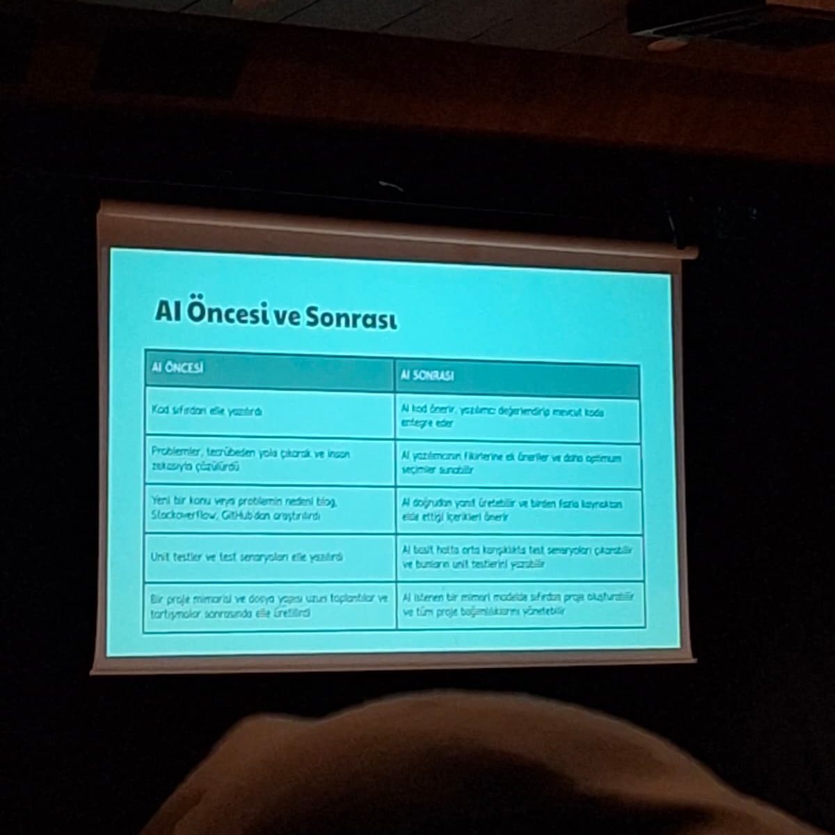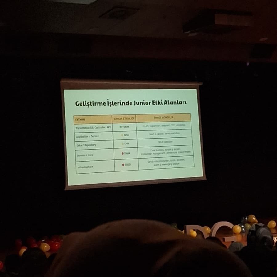 Tabloda gösterdiği “Geliştirme İşlerinde Junior Etki Alanları” başlıklı bölüm çok önemliydi. Yapay zekanın henüz başaramadığı, junior geliştiricilerin öğrenmesi gereken kritik alanları gösteriyordu. Maalesef telefon kamerasıyla çok net çekemediğim için detayları tam okuyamadım, ancak bu tabloyu isteyip yazıya ekleyeceğim. Bu alanlara hakim olan junior geliştiriciler, piyasada kendilerini farklılaştırabiliyorlar.